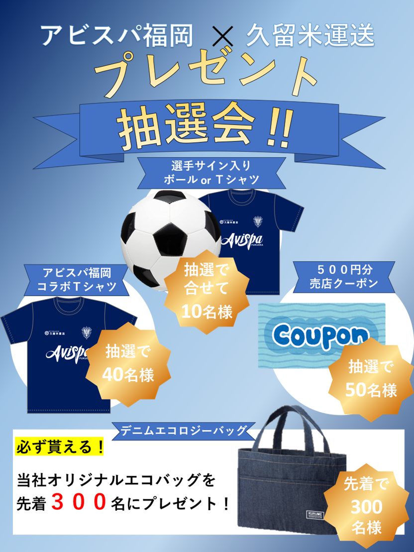 久留米運送特設ブースにて、選手サイン入りボールやアビスパ福岡コラボTシャツなどが当たるプレゼント抽選会を実施いたします!